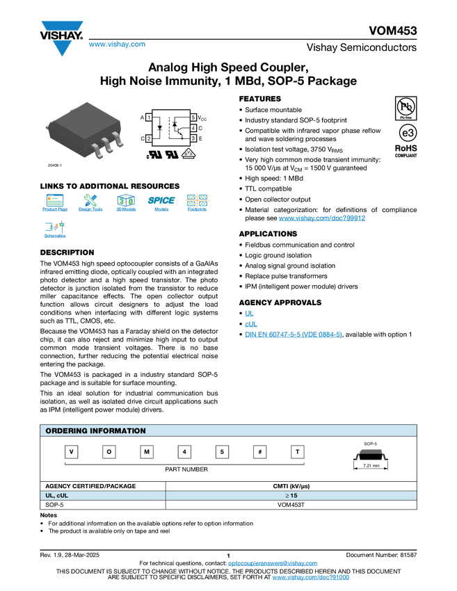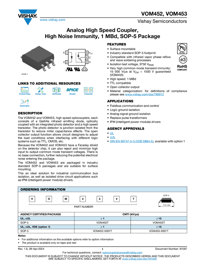 Analog High Speed Coupler, High Noise Immunity, 1 MBd, SOP-5 Package