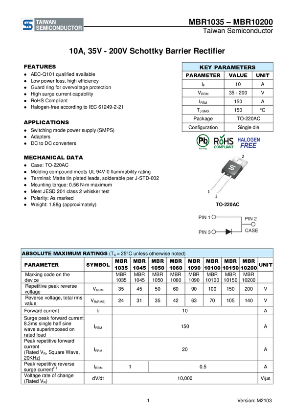 Schottky'ego 100V 10A TO220AC Taiwan Semiconductor MBR10100 N/A N/A N/A U(RRM) 100 V