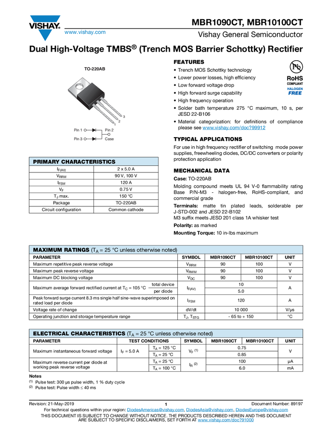Dual High-Voltage TMBS® (Trench MOS Barrier Schottky) Rectifier