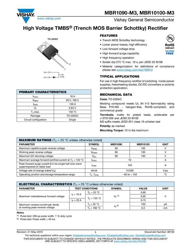 High Voltage TMBS® (Trench MOS Barrier Schottky) Rectifier