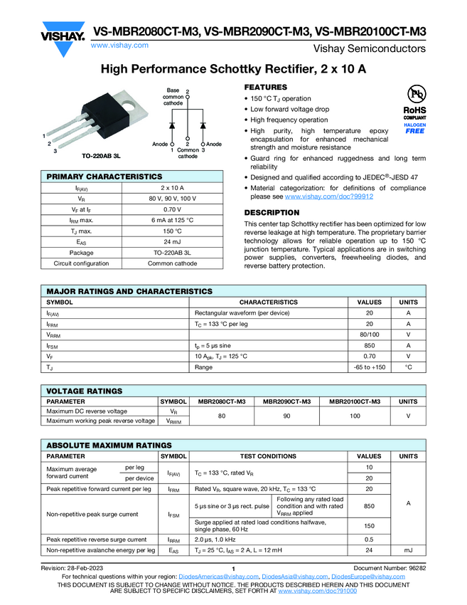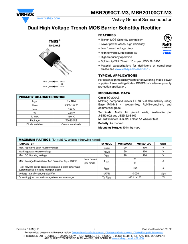 Dioda Schottky'ego Taiwan Semiconductor MBR20100CT N/A N/A N/A U(RRM) 100 V