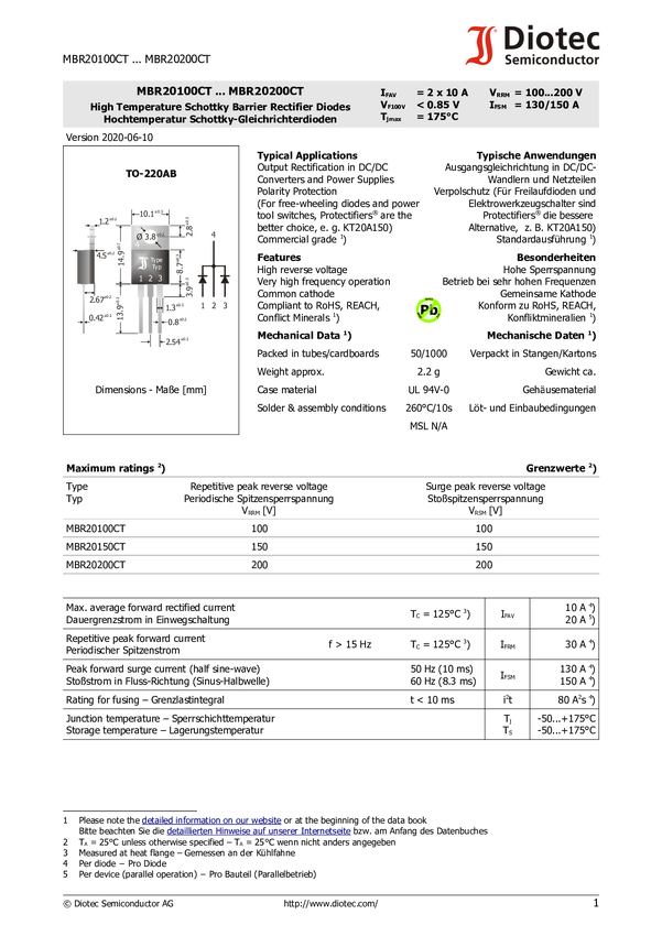 Schottky'ego, TO-220AB, 150V, 20A Diotec MBR20150CT N/A N/A N/A