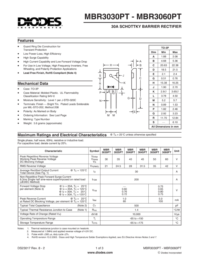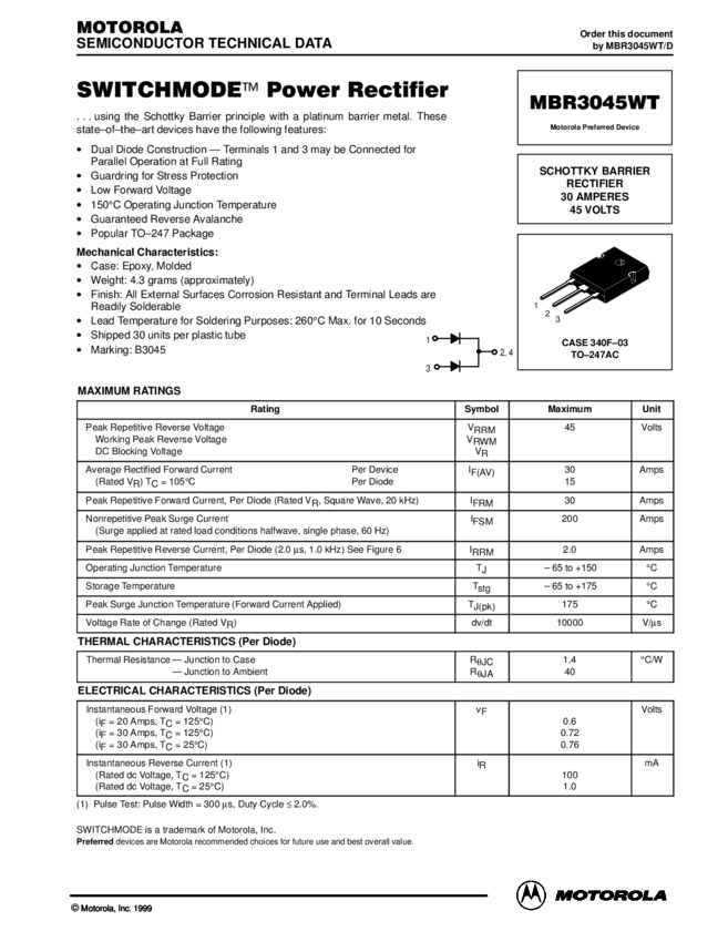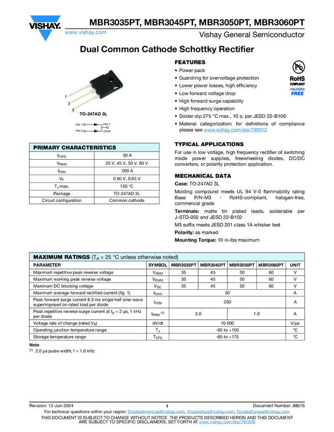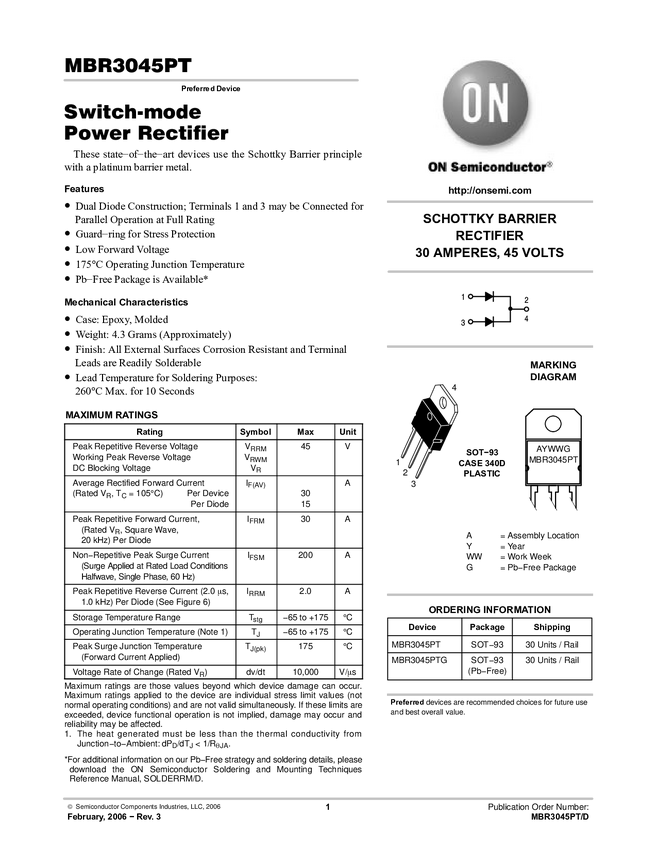 Dioda Schottky'ego Taiwan Semiconductor MBR3045PT N/A N/A N/A U(RRM) 45 V