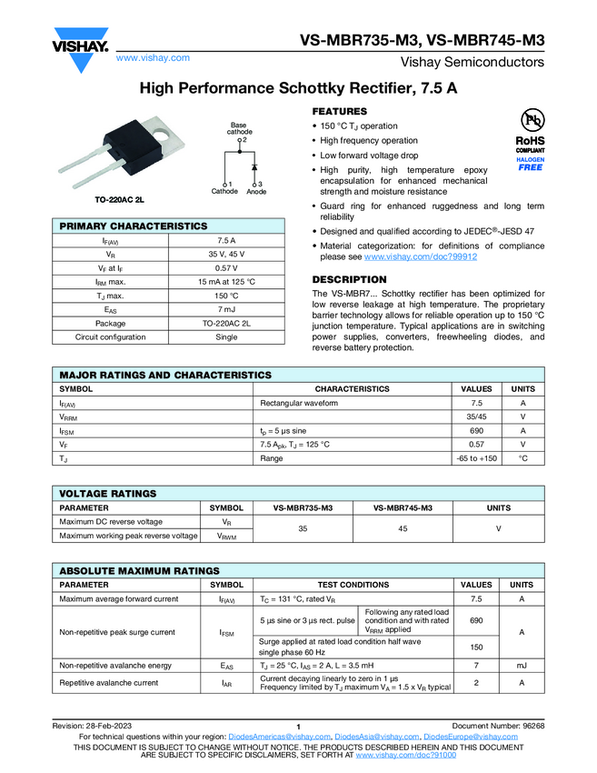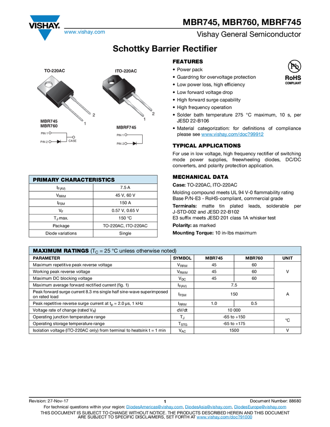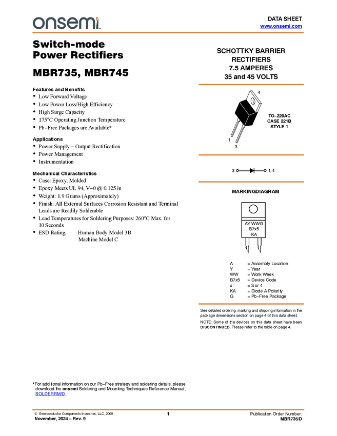 Schottky Barrier Rectifier, 7.5 A, 45 V