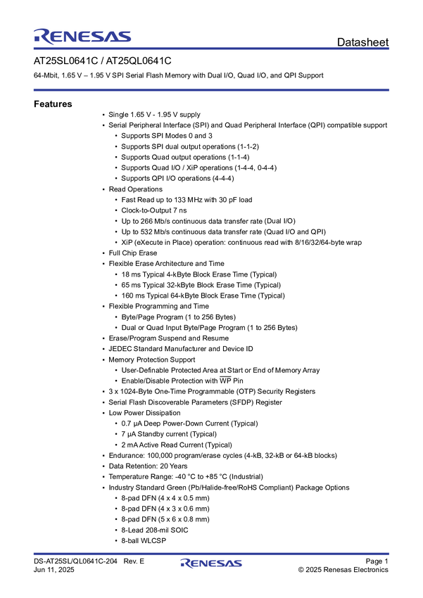 64Mbit, 1.8V SPI Serial Flash Memory with Single, Dual, Quad I/O and QPI Support