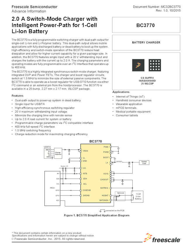 MC32BC3770, 2.0 A Switch-Mode Charger with Intelligent Power-Path for 1-Cell Li-Ion Battery