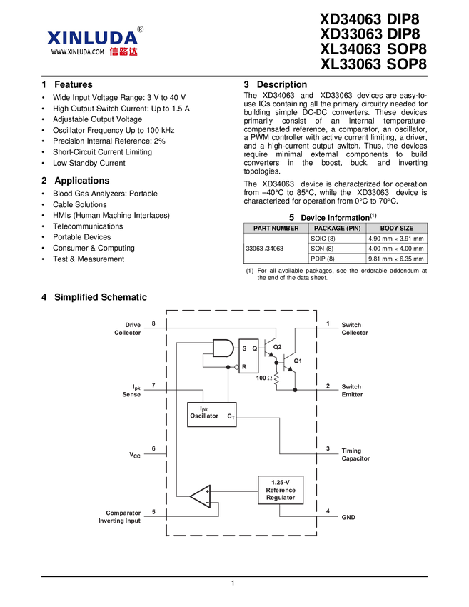 Układ scalony; XD34063; przetwornica DC/DC; Uwej:3-40V; Uwyj: 1,25-28V; 1,5A; DIP8; THT; = MC34063, TD34063, KA34063; XINLUDA; RoHS