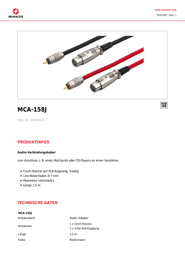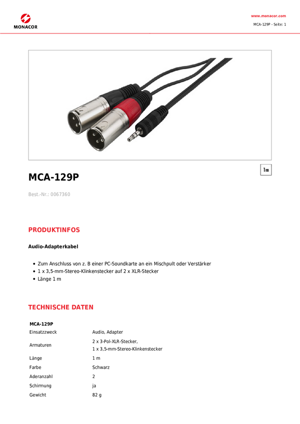 Audio adapter Monacor MCA-129P 0067360, XLR, Jack, 1 m