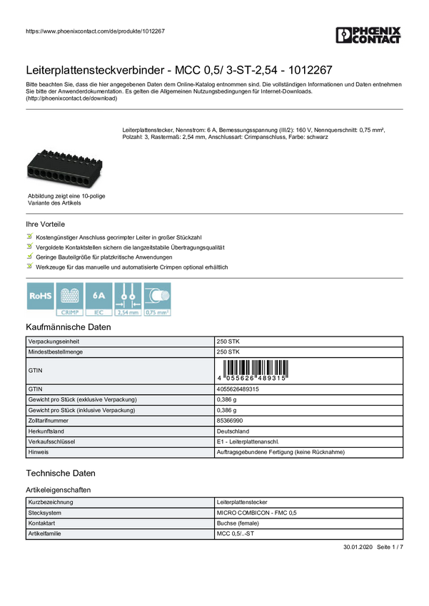 Phoenix Contact 1012267 Obudowa złącza pin żeńskiego na kabel MCC 0,5/ 3-ST-2,54, piny: 3, 6 A, 250 szt.