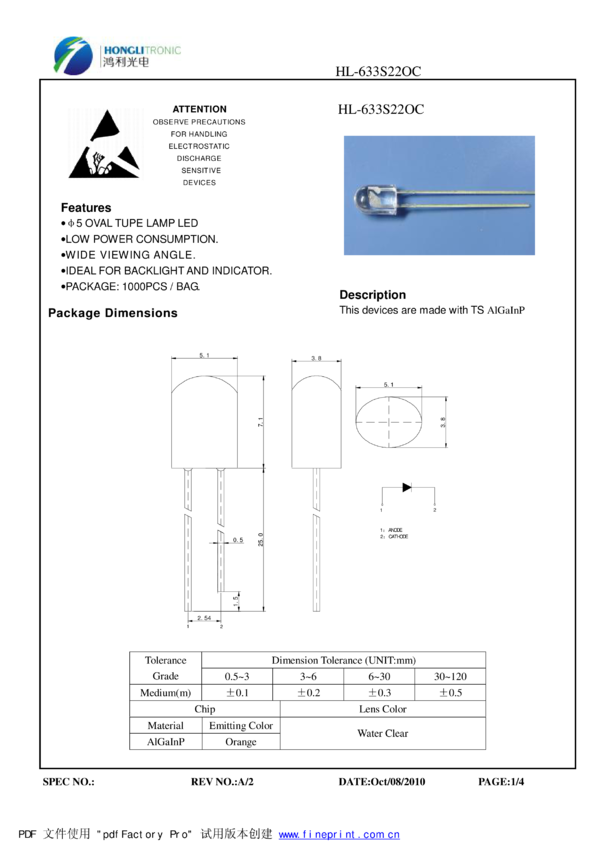 Dioda LED, owalna 5mm, -600-610 nm, super-jasna 460-1015 mCd, water clear, 100/50 stopni, Honglitronic