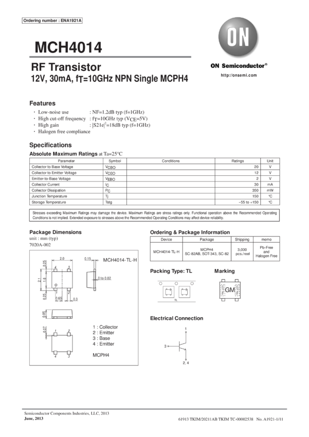 RF Transistor 8V 150mA fT;16GHz typ. NPN Single MCPH4
