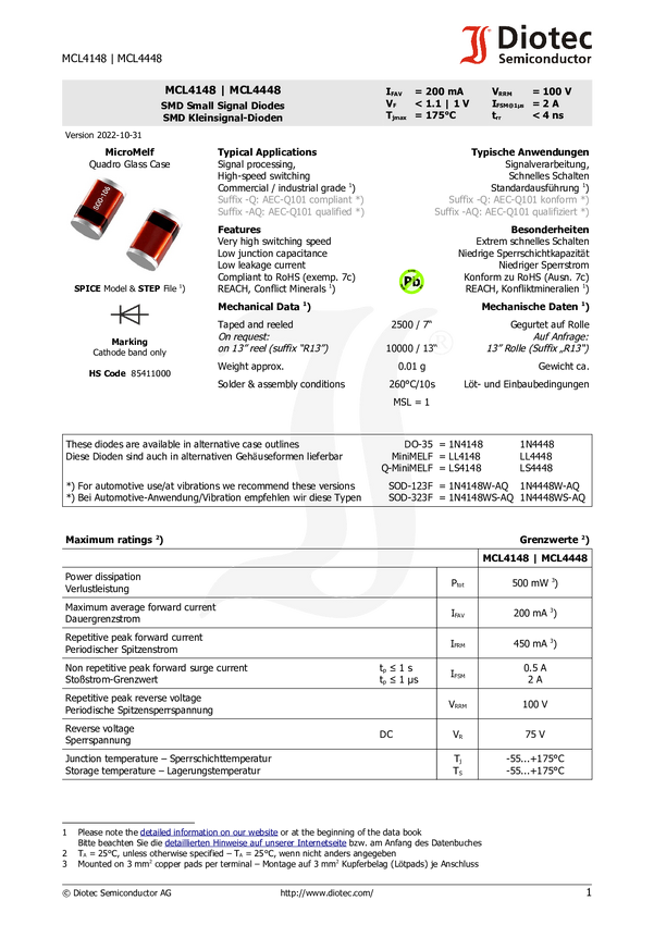 Dioda małego sygnału Diotec MCL4148R13 N/A N/A