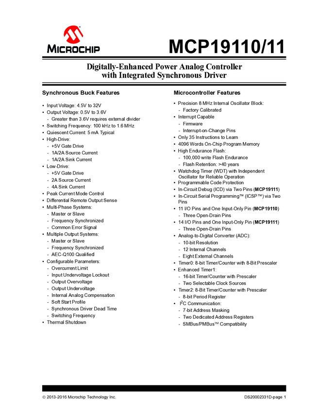 MCP19110/MCP19111 Analog Controller w/ Integrated Driver Data Sheet (03/16/2015)