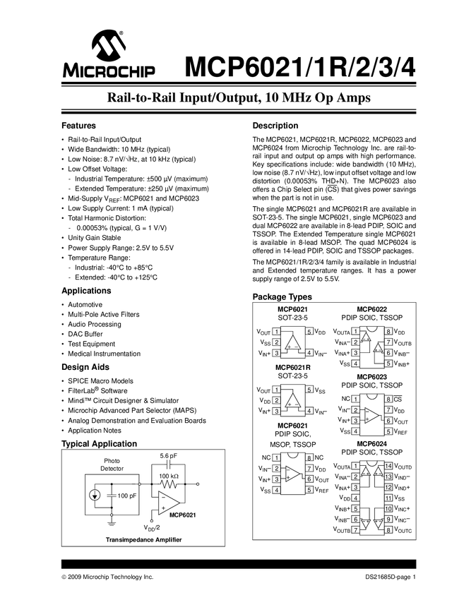 MCP6021/1R/2/3/4 - Rail-to-Rail Input/Output, 10 MHz Op Amps