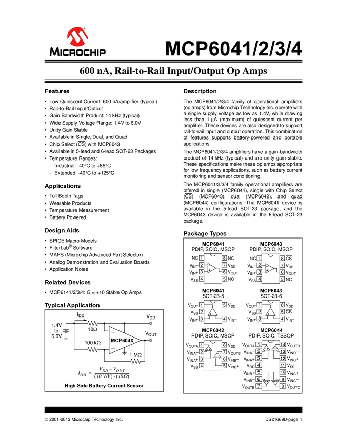 MCP6041/2/3/4 - 600nA, Rail-to-Rail Input/Output Op Amps