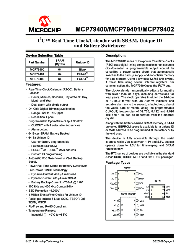 MCP79400/01/02 I2C Real-Time Clock/Calendar w/ SRAM, Unique ID (12/15/2011)