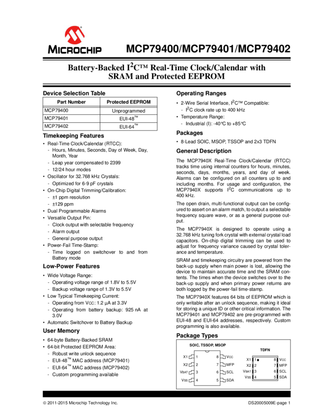 MCP79400/01/02 Battery-Backed I2C RTCC w/ SRAM and Protected EEPROM (03/04/2015)