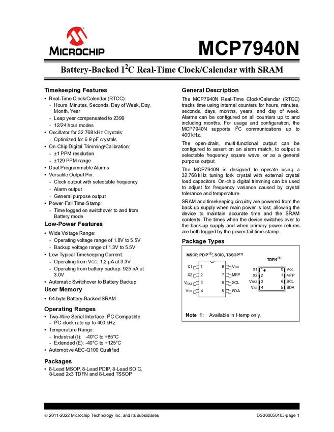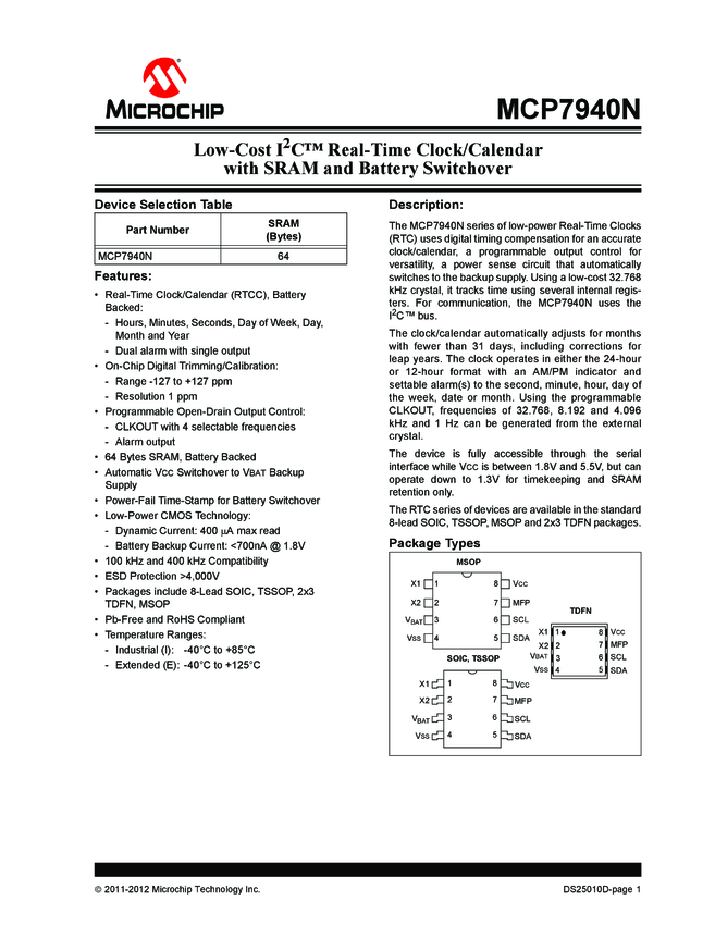 MCP7940N Low-Cost I2C Real-Time Clock/Calendar with SRAM and Battery Switchover (11/29/2012)