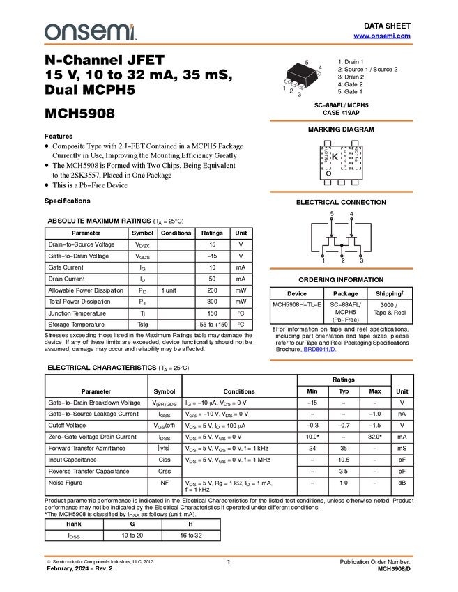 Junction FET 15V 50mA IDSS 10 to 32 mA N-Channel Dual MCPH5