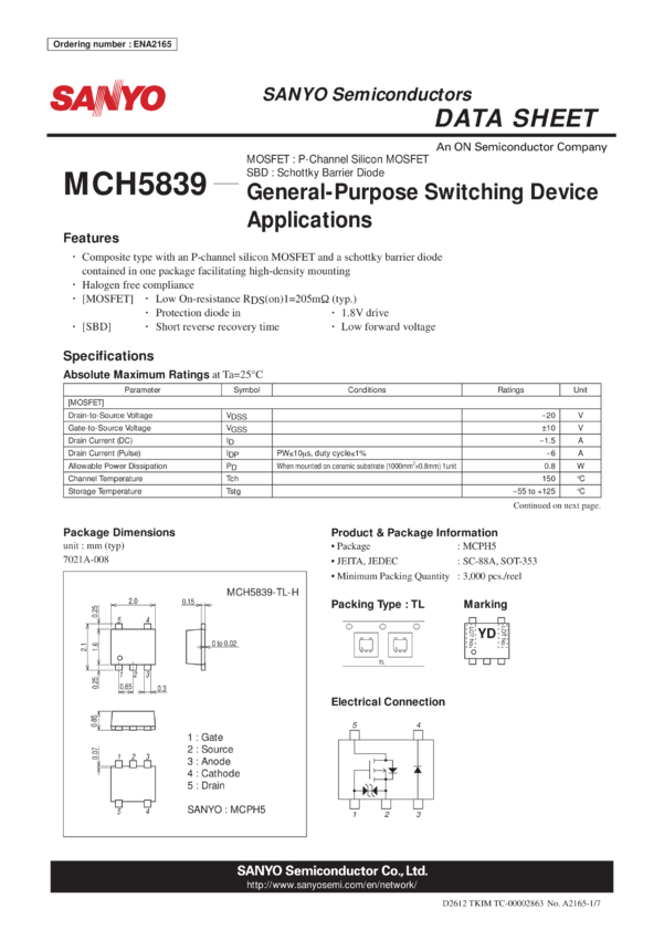 Small Signal MOSFET -20V -1.5A 266 mOhm Single P-Channel MCPH5 with Schottky Diode