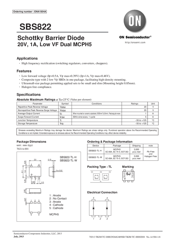 1.0 A, 20 V, Schottky Barrier Diode, Low VF Dual MCPH5