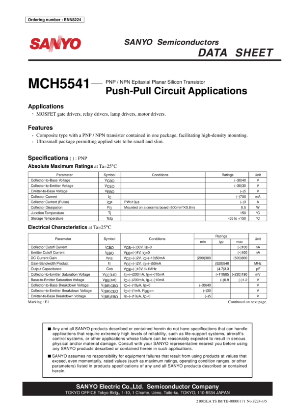 Bip Transistor (-)30V (-)700mA VCE(sat);(-220)190mV max. PNP/NPN 2 in 1 type MCPH5