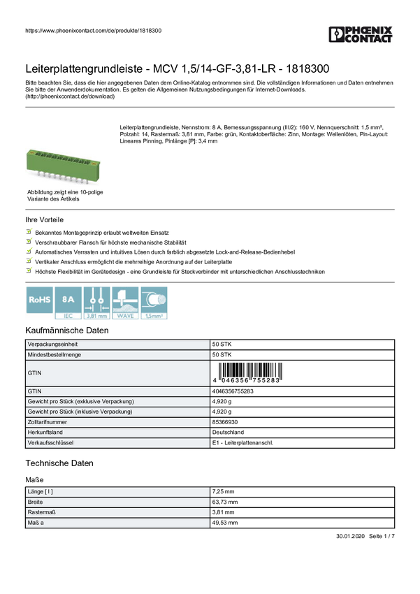 Phoenix Contact 1818300 Obudowa złącza pin męskiego na PCB MCV 1,5/14-GF-3,81-LR, piny: 14, 8 A, 1 szt.