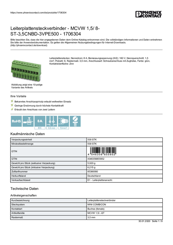 Phoenix Contact 1706304 Obudowa złącza pin żeńskiego na kabel MCVW 1,5/ 8-ST-3,5CNBD-3VPE500, piny: 8, 8 A, 500 szt.