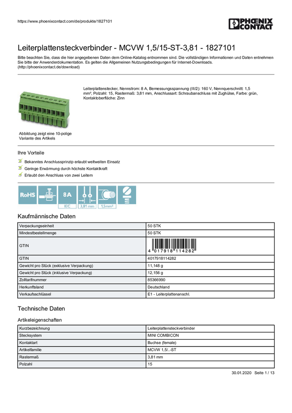 Phoenix Contact 1827101 Obudowa złącza pin żeńskiego na kabel MCVW 1,5/15-ST-3,81, piny: 15, 8 A, 1 szt.