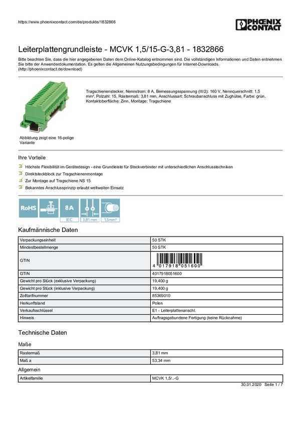 Phoenix Contact 1780969 Obudowa złącza pin męskiego na PCB MCV 1,5/ 6-G-3,5 P20 THRR56, piny: 6, 8 A, 200 szt.