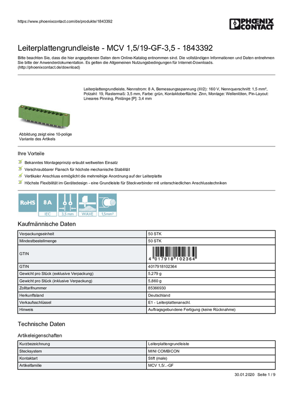 Phoenix Contact 1707078 Obudowa złącza pin męskiego na PCB MCV 1,5/ 9-G-3,81 P14 THR, piny: 9, 8 A, 50 szt.