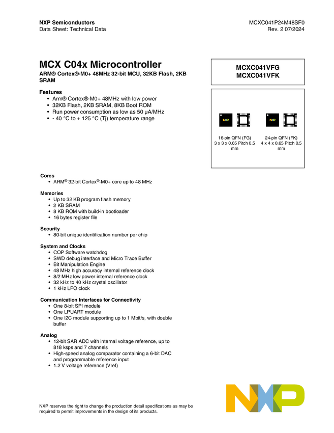MCX C04x MCUs with Arm® Cortex® M0+, Entry Level MCUs with Classical Peripherals