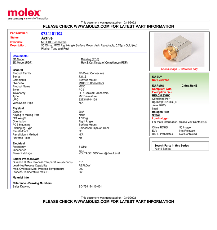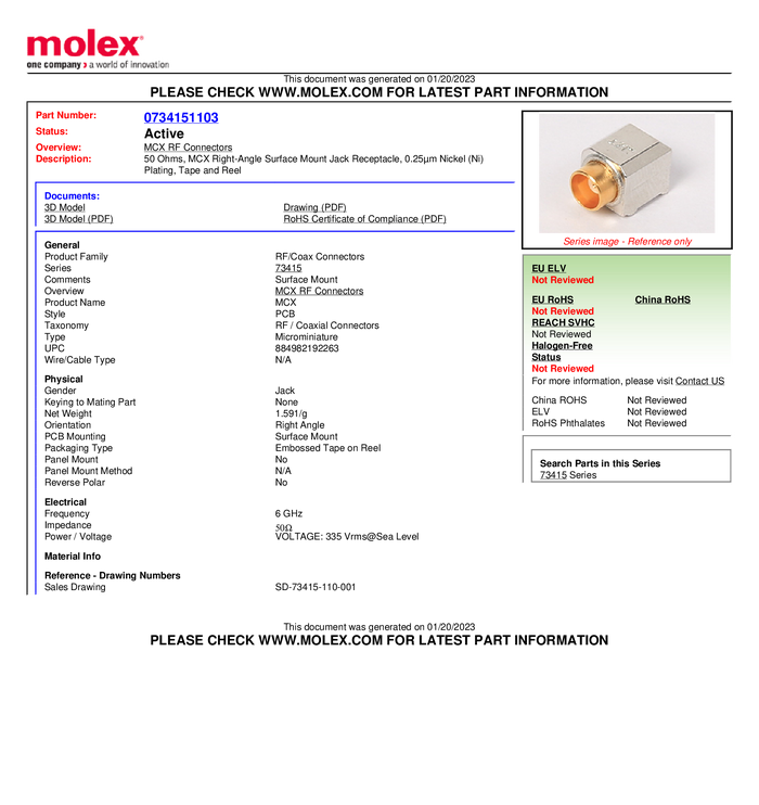 Złącze MCX Molex 734151103 złącze żeńskie kątowe 50 Ω 1 szt.