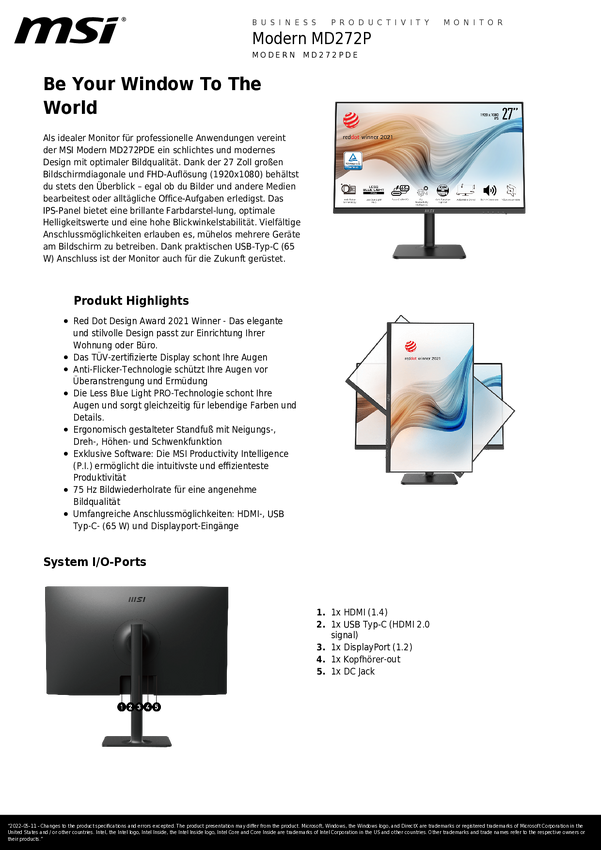 MSI Modern MD272PDE Monitor EEK F (A - G) 68.6 cm (27 cal) 1920 x 1080 px 16:9 5 ms HDMI, USB-C®, DisplayPort, słuchawki