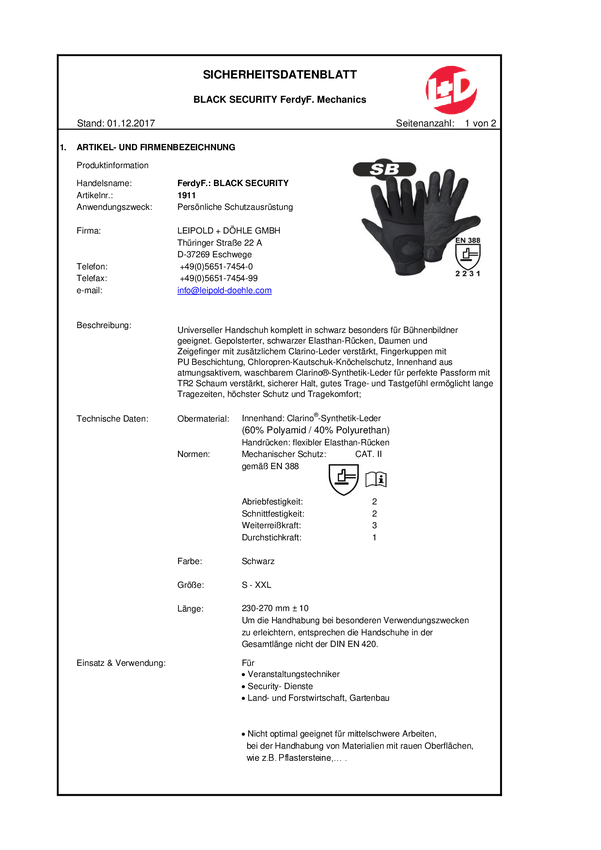 FerdyF. BLACK SECURITY Mechanics 1911-7 Sztuczna skóra Clarino® Rękawice montażowe Rozmiar rękawic: 7, S EN 388 CAT II 1