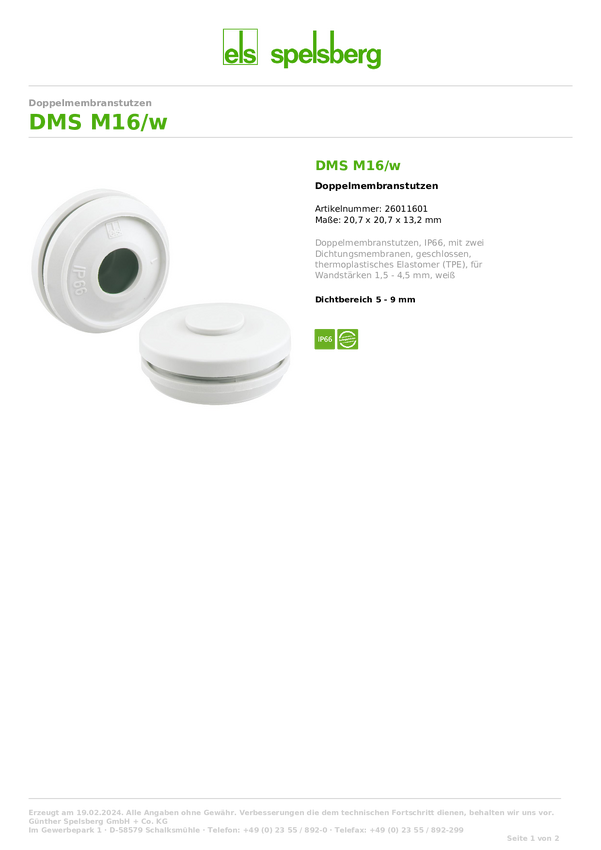 Spelsberg 26013201 Podwójne złącze membranowe odporna na promieniowanie UV, bezhalogenowa biały 1 szt.