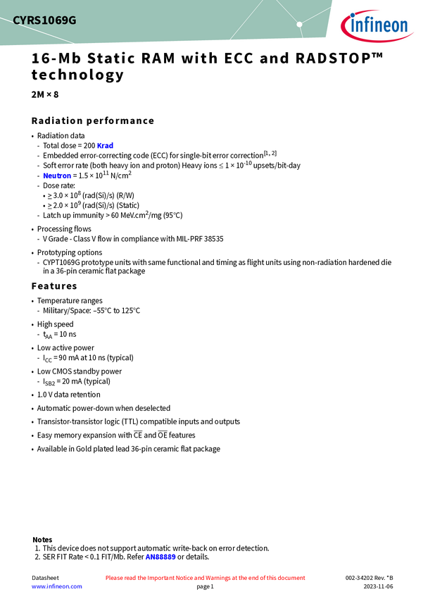 Infineon’s FAST 16Mb asynchronous SRAM family, designed with Infineon’s patented RADSTOPTM technology is ideal for space as well as other harsh environment applications. The 16Mb Fast SRAM is a high-performance, low power SRAM with ECC organized as 2-Mbit by 8-bits. Infineon’s radiation hardened memories are QML-V certified, meeting the reliability and lifecycle demands of extreme environments. Our RADSTOPTM memory solutions enhance overall system computing limits while providing Size, Weight, and Power (S