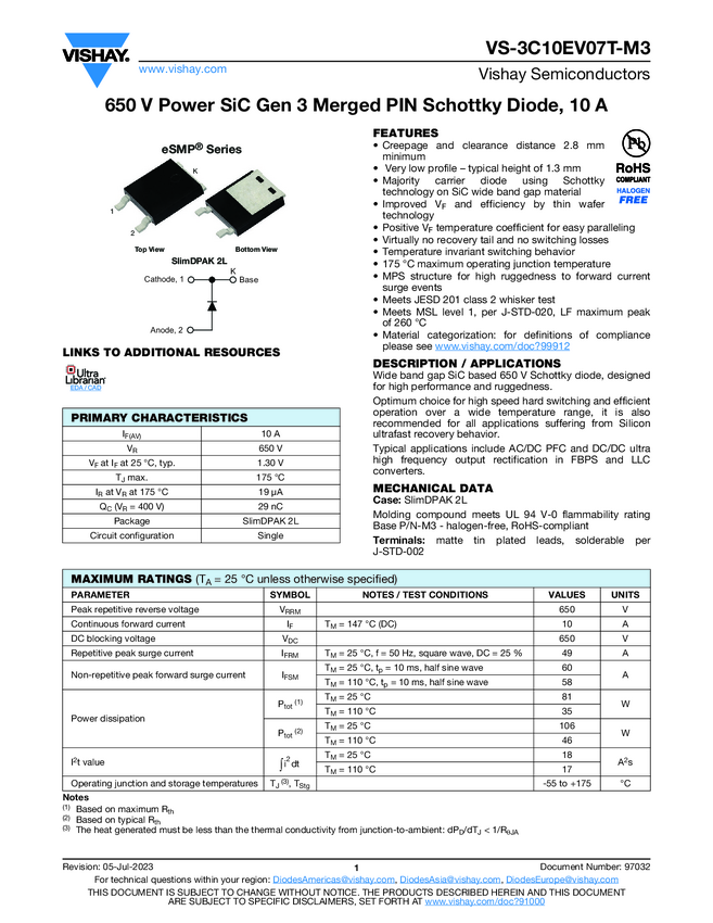 650 V Gen 3 Power SiC Merged PIN Schottky Diode, 10 A