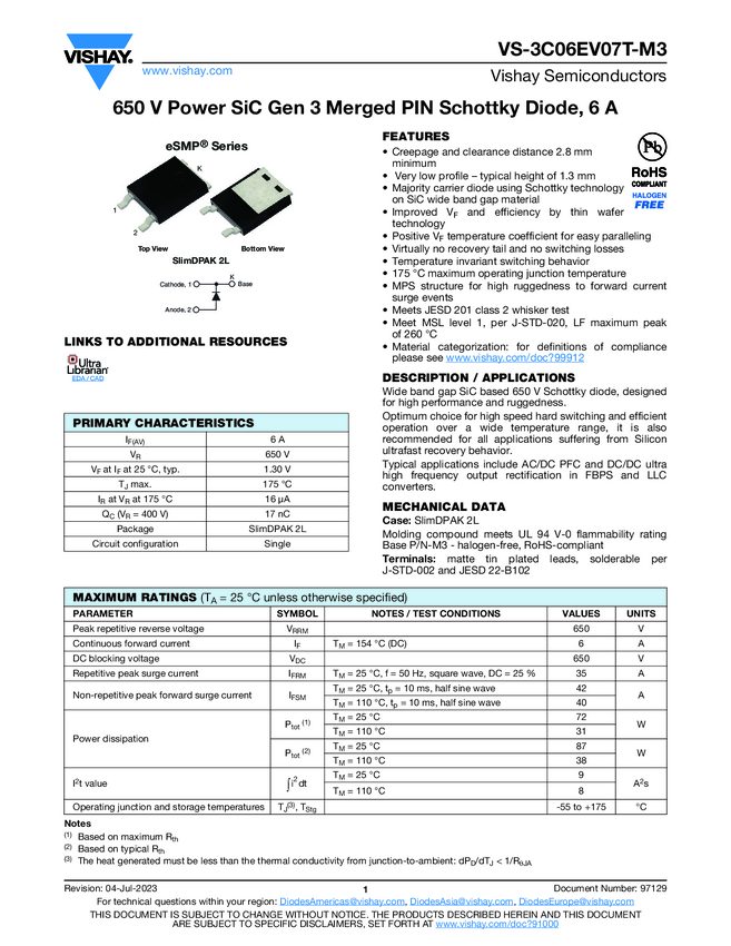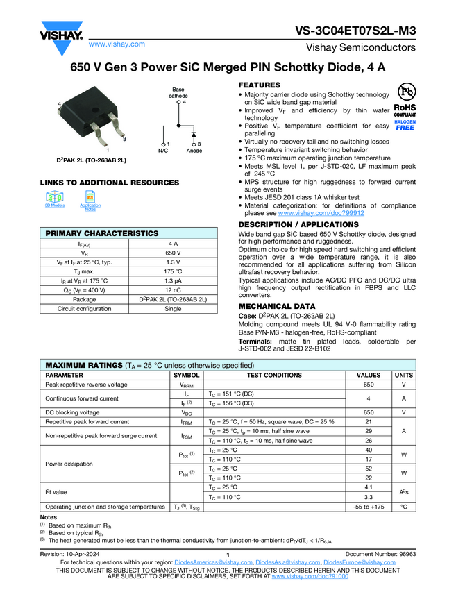 650 V Power SiC Merged PIN Schottky Diode, 4 A
