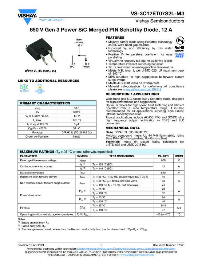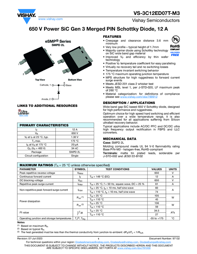 650 V Gen 3 Power SiC Merged PIN Schottky Diode, 12 A