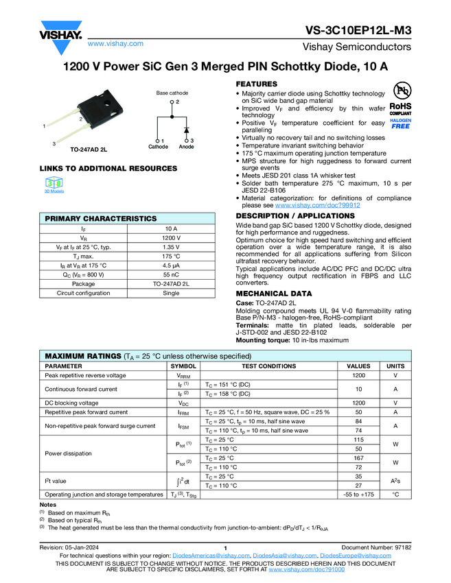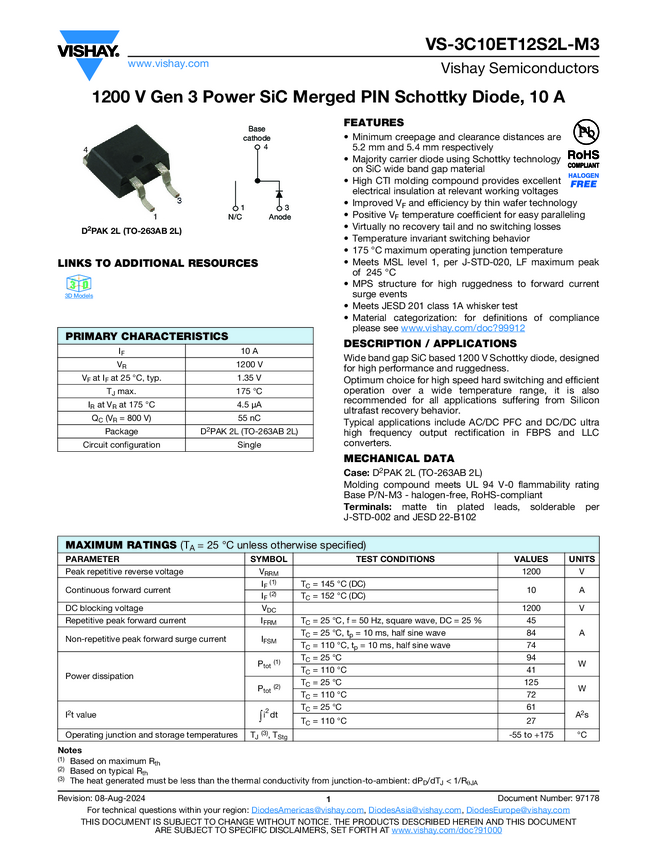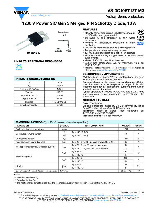 1200 V Gen 3 Power SiC Merged PIN Schottky Diode, 10 A