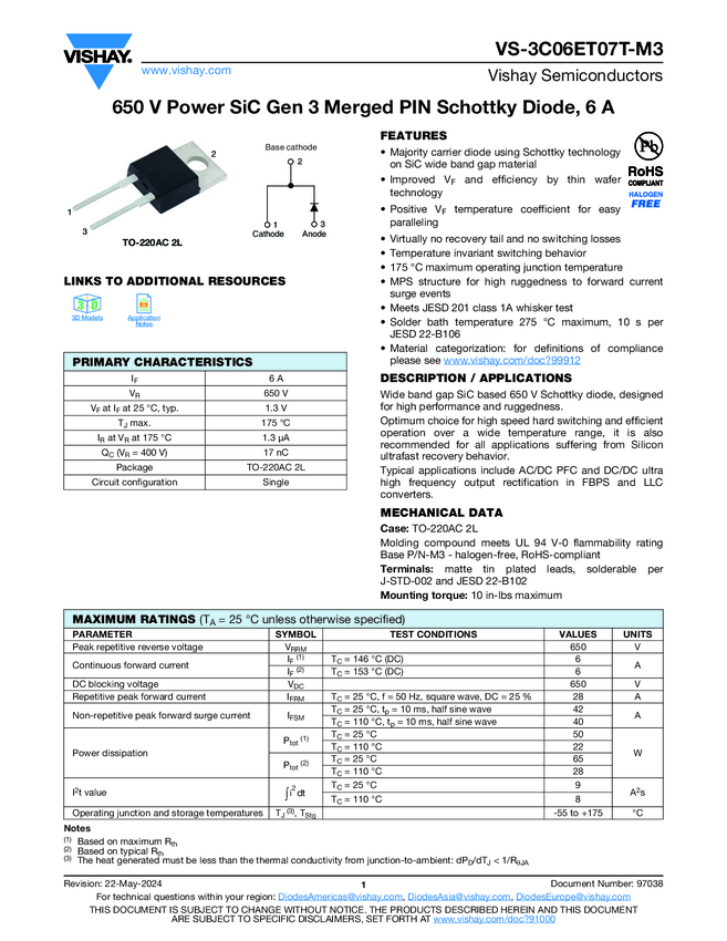 650 V Gen 3 Power SiC Merged PIN Schottky Diode, 6 A