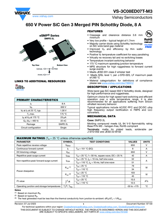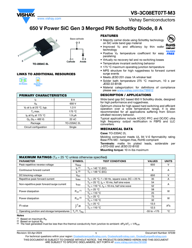650 V Gen 3 Power SiC Merged PIN Schottky Diode, 8 A