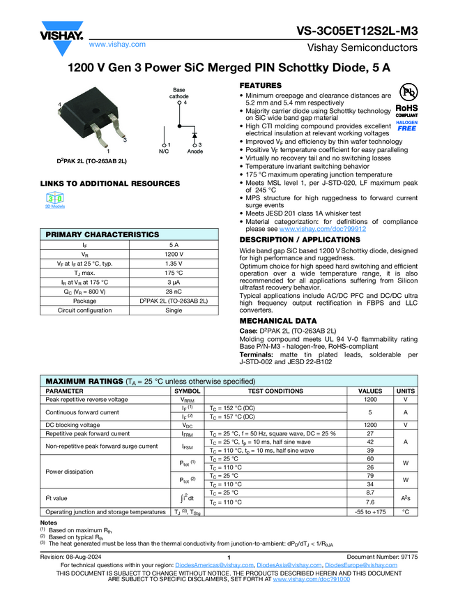 1200 V Power SiC Merged PIN Schottky Diode, 5 A
