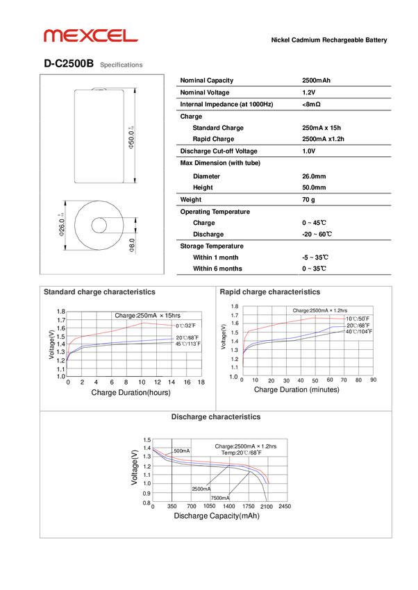 Pakiet akumulatorów C (R14), NiCd Mexcel NS2500CHT, Ilość ogniw: 6, 7.2 V, 2500, Możliwa wysoka temperatura, Płaskie złą