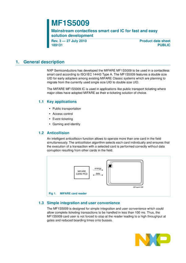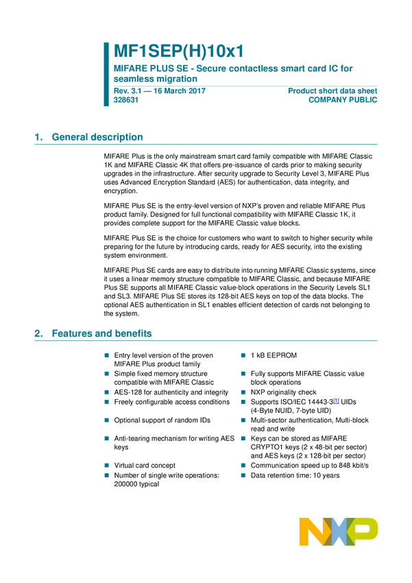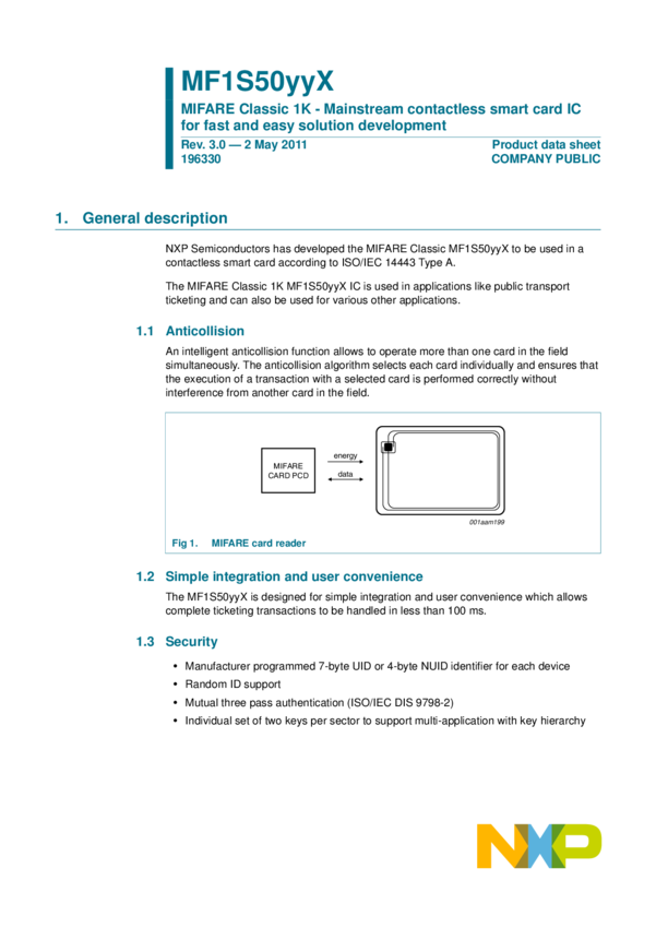 MIFARE Classic EV1 1K - Mainstream contactless smart card IC for fast and easy solution development