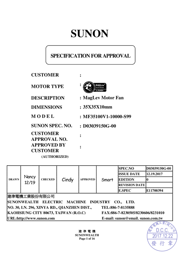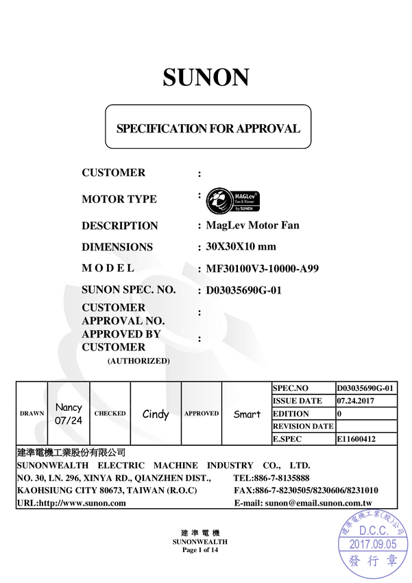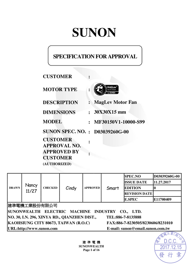 Wentylator osiowy Sunon MF30150V1-1000U-S99, 5 V/DC, 10.2 m³/h, (D x S x W) 30 x 30 x 15 mm