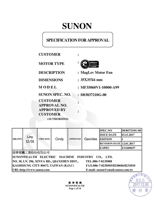 Wentylator osiowy Sunon MF35060V1-1000U-A99, 5 V/DC, 9.35 m³/h, (D x S x W) 35 x 35 x 6 mm