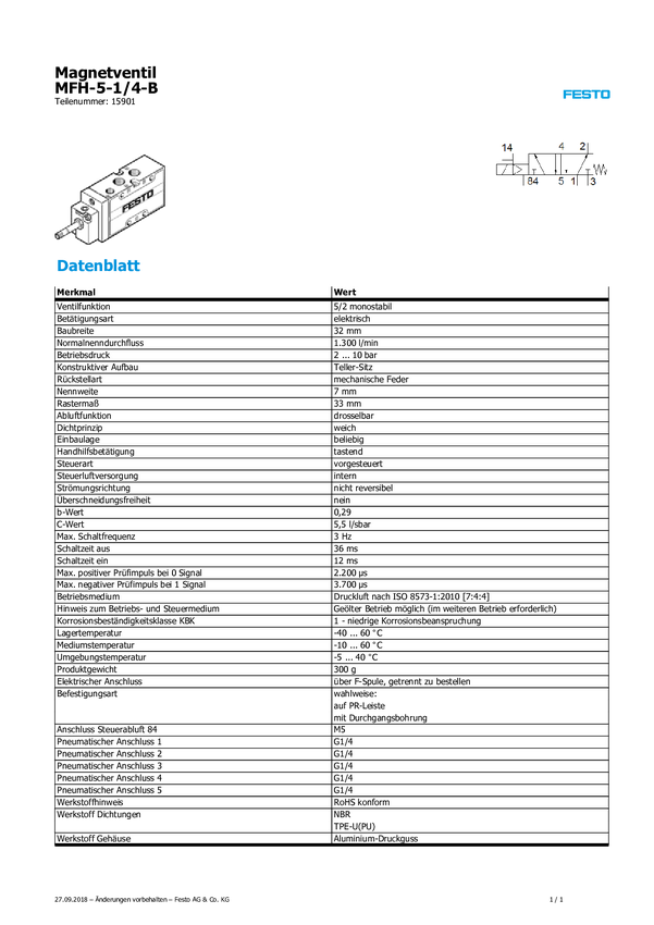 Zawór magnetyczny FESTO MFH-5-1/4-B 15901, 2 do 10 bar