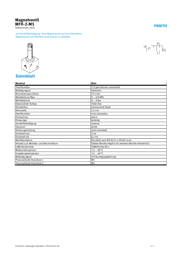 Zawór magnetyczny FESTO MFH-2-M5 4573, 0 do 8 bar